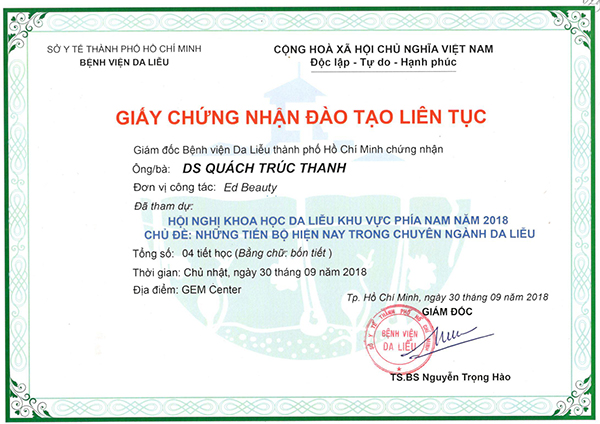 Vừa qua, tại Hội nghị khoa học da liễu- khu vực phía Nam năm 2018 với chủ đề: “ Những tiến bộ hiện nay trong chuyên ngành Da liễu” Dược sĩ Tina đã vinh dự tham gia và được học hỏi thêm về những phương pháp điều trị tiên tiến sẽ được giải đáp trong khuôn khổ Hội nghị với sự góp mặt của các Bác sĩ, Chuyên gia hàng đầu trong lĩnh vực Da liễu tại các quốc gia tiên tiến như Singapore và Ý, cùng với các chuyên gia đầu ngành trong lĩnh vực Da Liễu tại Tp.Hồ Chí Minh.
