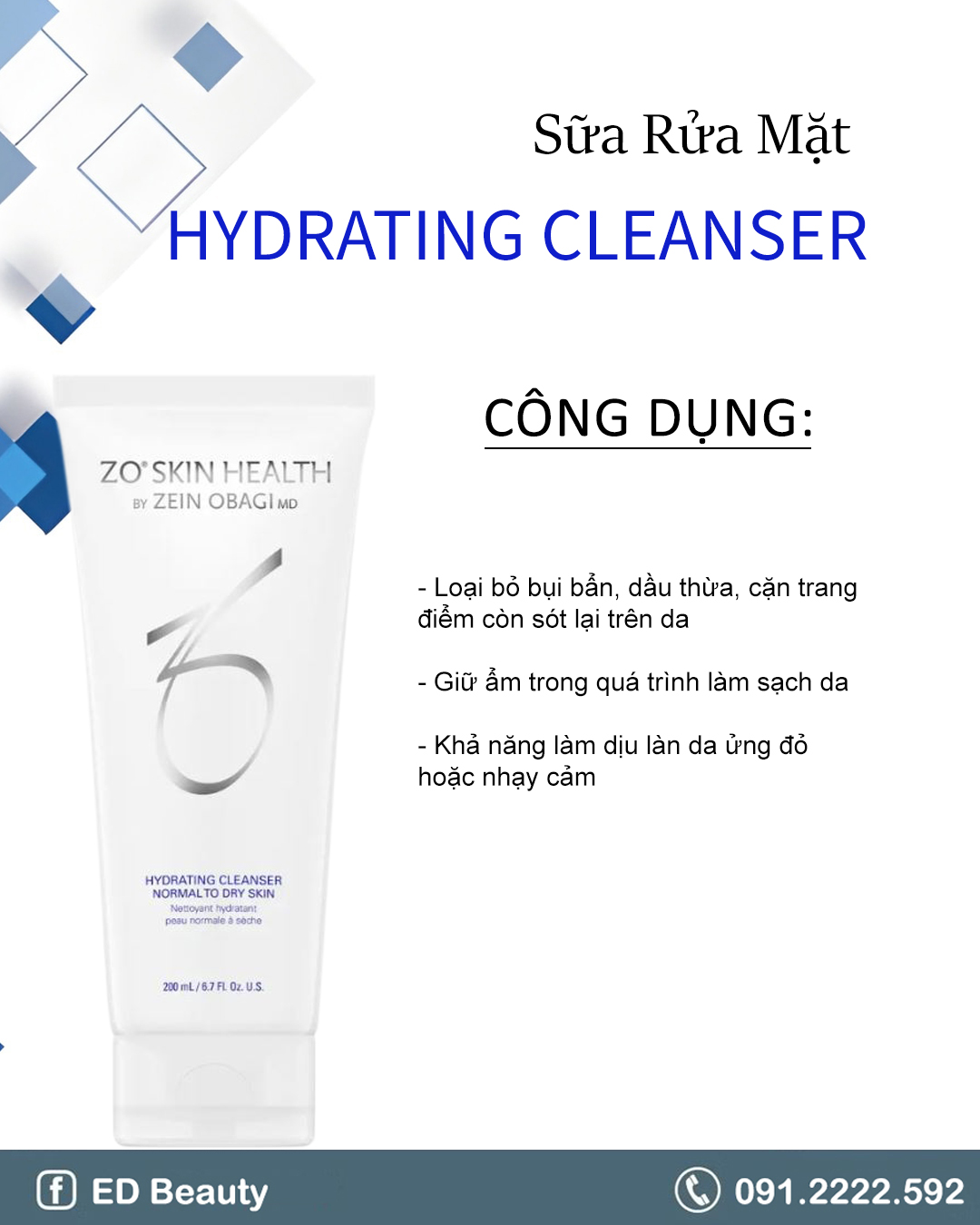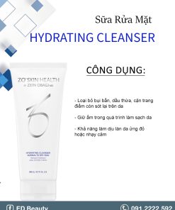 Mỗi ngày, làn da chúng ta phải tiếp xúc biết bao khói bụi, ô nhiễm và dầu nhờn có sẵn trên da. Vì thế, làm sạch da với sữa rửa mặt chuyên dụng là điều cần thiết nếu muốn duy trì làn da mềm mại, không tì vết. Zo Skin Health là thương hiệu Dược mỹ phẩm đến từ Mỹ, được nhiều chuyên gia da liễu khuyên dùng. Sữa rửa mặt Zo Skin Health Hydrating Cleanser dành cho da thường đến da khô, giúp nhẹ nhàng loại bỏ bụi bẩn và phục hồi bề mặt da bị tổn thương, đồng thời cung cấp độ ẩm cho da. Bên cạnh đó, kết hợp với Allatoin còn giúp làm tăng hàm lượng nước có trong da, từ đó giảm kích ứng và đỏ da. Phục hồi các tế bào tổn thương, mang lại làn da khỏe mạnh, sẵn sáng hấp thụ các dưỡng chất tiếp theo.